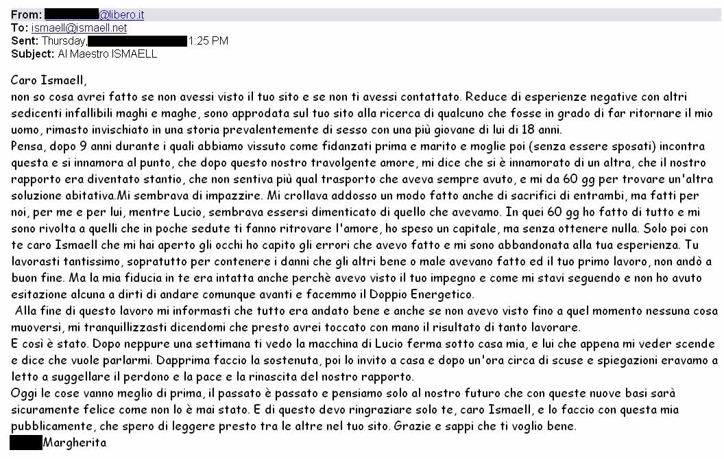 Mi sembrava di impazzire. Mi crollava addosso un modo fatto anche di sacrifici di entrambi, ma fatti per noi, per me e per lui, mentre Lucio, sembrava essersi dimenticato di quello che avevamo. In quei 60 gg ho fatto di tutto e mi sono rivolta a quelli che in poche sedute ti fanno ritrovare l’amore, ho speso un capitale, ma senza ottenere nulla. Solo poi con te caro Ismaell che mi hai aperto gli occhi ho capito gli errori che avvevo fatto e mi sono abbandonata alla tua esperienza. Tu lavorasti tantissimo, sopratutto per contenere i danni che gli altri bene o male avevano fatto ed il tuo primo lavoro, non andò a buon fine. Ma la mia fiducia in te era intatta anche perchè avevo visto il tuo impegno e come noi stavi seguendo e non ho avuto esitazione alcuna a dirti di andare comunque avanti e facemmo il Doppio Energetico.