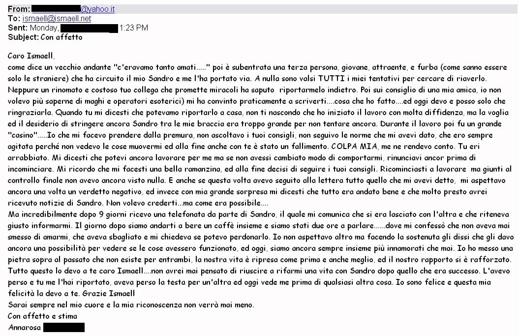 come dice un vecchio andante “c’eravamo tanto amati…..” poi è subentrata una terza persona, giovane, attraente, e furba (come sanno essere solo le straniere) che ha circuito il mio Sandro e me l’ha portato via. A nulla sono valsi TUTTI i miei tentativi per cercare di riaverlo. Neppure un rinomato e costoso tuo collega che promette miracoli ha saputo riportarmelo indietro. Poi sui consiglio di una mia amica, io non volevo più saperne di maghi e operatori esoterici) mi ha convinto praticamente a scriverti….cosa che ho fatto….ed oggi devo e posso solo che ringraziarla.